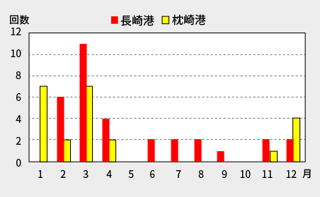 (注1) 「あびき」とは、海面が短時間のうちに昇降を繰り返す現象のことを指す。沖合での気圧の急変によって発生した水深に比べ波長の長い波が、増幅しながら湾や港に侵入する事により、大きな「あびき」が発生する。地形や水深が1つの要因である事から、過去に被害が発生した場所は大きな「あびき」被害が発生しやすい。100センチを超える大きな「あびき」の発生は、そのほとんどが冬から春にかけての季節に多い事が分かっている。(参照:福岡管区気象台)
