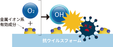金属イオン系有効成分が酸素と反応することで活性酸素(OHラジカル)が発生。