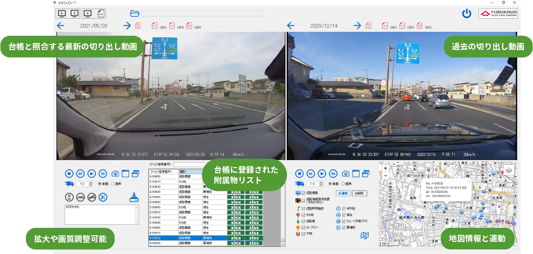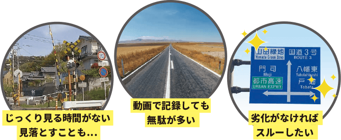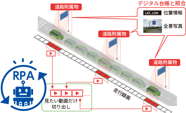 「みちてんクルーズ」は、道路巡回車に取り付けたドライブレコーダーの走行動画から、点検表の記載情報に基づき、あらためて道路附属物の動画をコンパクトに切り出しデータ化。道路附属物の日常巡視を強化し、効率的、合理的な予防保全を実現します。