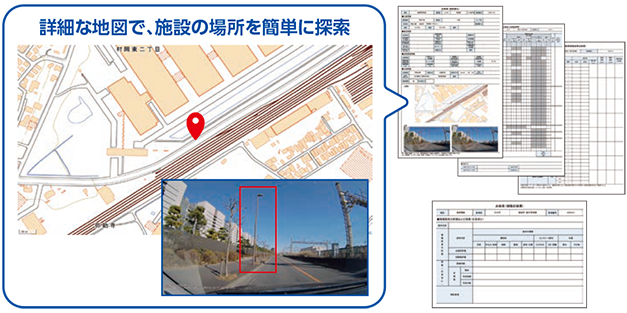 みちてんスナップの出力データを読み込み、施設のリストから全景写真、地図、点検表をすばやく表示。