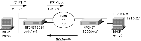 本装置を介して、異なるネットワーク上に存在するDHCPサーバとDHCPクライアントの通信を可能にします。INFONET3791は、クライアントからDHCPサーバへのブロードキャストフレームを受信すると、サーバのIPアドレス宛のユニキャストフレームとして送信します。