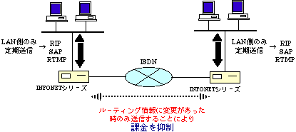 ISDN回線へ定期送信せず抑制し、経路に変更があったときのみ自動的に回線を接続し経路制御パケットを送受信します。(トリガードアップデート方法)