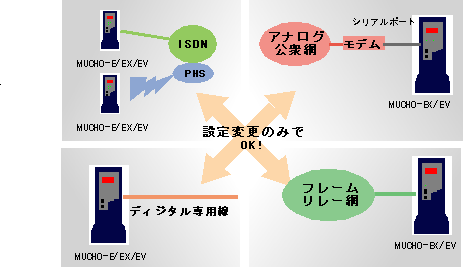 MUCHO-EではISDN(PIAFS),高速ディジタル専用線,MUCHO-EX/EVではISDN(PIAFS),高速ディジタル専用線のほかにフレームリレー,アナログ回線を利用することができるようになりました。