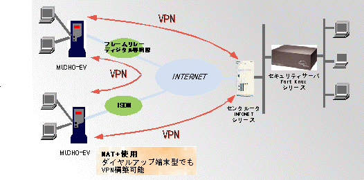 MUCHO-EVでは,IPsecに準拠したVPN機能を搭載しています。これにより,本社−支社間を通信コストの低廉なインターネットVPNで結ぶことで,セキュアなイントラネットを構築することができます。