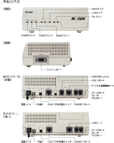 | ディジタル通信機器ポート(S/T点) | 内蔵(MUCHO-TL-DSUのみ、停電時は乾電池でバックアップ) | |