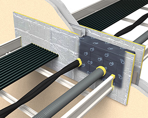 建築物の防火壁・床をケーブルや配管が貫通する部分は、火災拡大防止のため、国土交通大臣から認定された防火材料で埋め戻すことが建築法で義務づけられています。近年は、防火性能に加えて隣室への遮音性能、施工後の化粧性や振動・風圧への対応などニーズが多様化しています。
