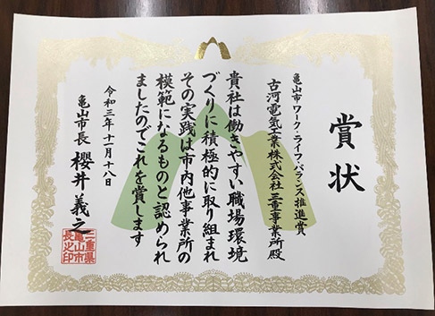 三重事業所 亀山市より「ワーク・ライフ・バランス推進賞」を受賞