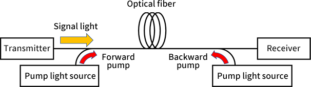 Pump light is introduced into an optical fiber in two directions: backward pump, in which the pump light is in the opposite direction of the signal light, and forward pump, in which the pump light is in the same direction as the signal light. In backward pump, the signal and pump light face each other, so the pump light noise (fluctuation of output power) is averaged out, whereas in forward pump, the pump light travels at the same speed as the signal, so the pump light noise easily affects the signal. For this reason, the pump light source used for forward pump must have low noise. Compared to backward pump, which is already widely used in practical applications, forward pump is technically more difficult, but it is expected to be realized because it is superior in improving transmission characteristics and maximizing the effect of Raman amplification.