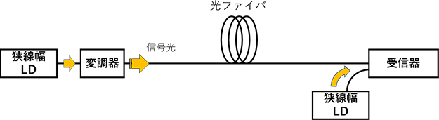 コヒーレント方式では、信号光源およびLOの位相ノイズ、すなわちスペクトル線幅が重要な特性となります。線幅が広いと位相ノイズが増えて信号にノイズがのってしまいます。より高速、より長距離への通信では、より狭い線幅の半導体レーザが信号光源として必要となります。