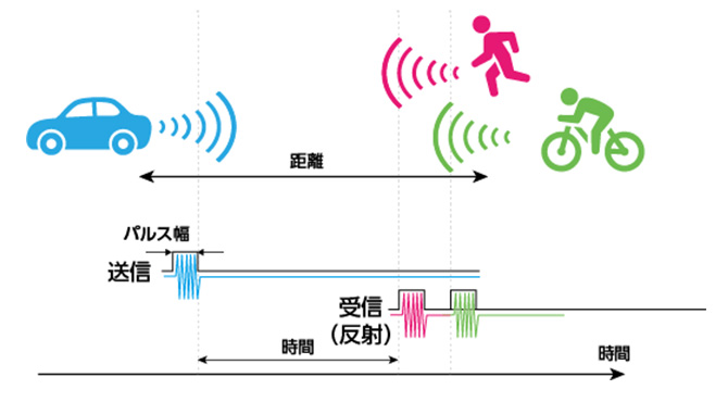 一方、古河ASの周辺監視レーダで採用しているパルス方式のレーダは、電波を“断続”的に発信し、受信波が返ってくるまでの時間で対象物との「距離」を、返ってきた受信波の周波数で「相対速度」を計測します。このように距離と速度を個別に計測することで、障害物や人、標識など複数の対象物の個別検知が可能になりました。また、準ミリ波である24GHz帯の電波には、降雨などによる性能の減衰やバンパを透過する際の伝搬損失が比較的少ないという特長があるため、検知性能においても優れています。