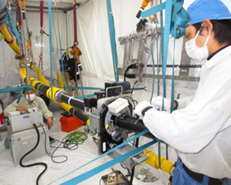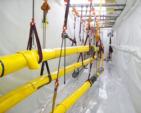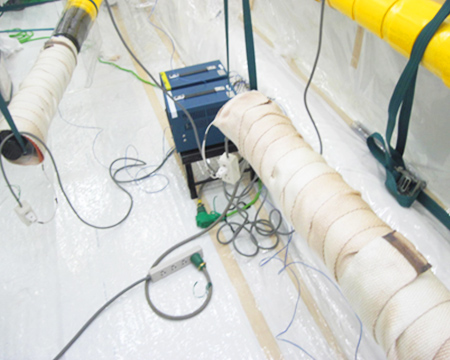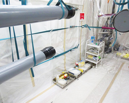 図面で指示された寸法の通りケーブルの処理が完了したら次の接続工程に入りますが、ここからは湿気やゴミが入り込むのを防ぐため、区画ルームの中にクリーンルームを設置します。JOINTERたちもここからは髪の毛などが落ちないように防塵服を着用します。