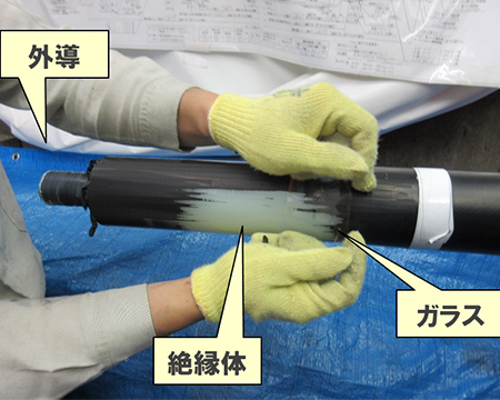 ジョイントの電気特性に大きく影響を与える重要な工程で、板ガラスを使用して外部半導電層を削ります。現場では敷設された電力ケーブルを処理するので、身体をうまく使い、すべての面を削ります。