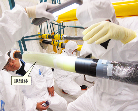 ケーブル絶縁体に半導電性のテープを巻きつけ、ヒーターで加熱しケーブルに融着させる工程です。この作業では、ケーブルの表面に微細なゴミの付着や傷なども絶縁破壊事故の原因となるため、何人もの目で確認します。この時、肉眼で約200µm(0.2mm)の大きさのゴミも見分けなくてはなりません。