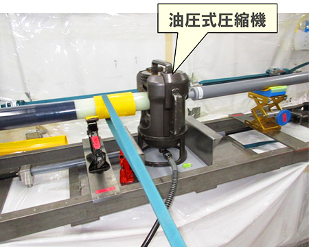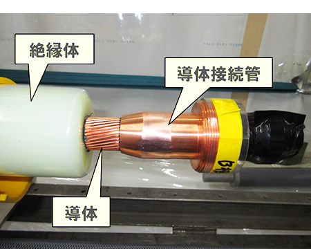ケーブル先端部の絶縁体を剥き出し(口出し)、導体を露出させ導体接続管を挿入します。油圧式圧縮機を用いてしっかりと圧着します。