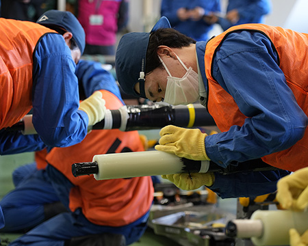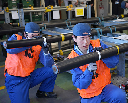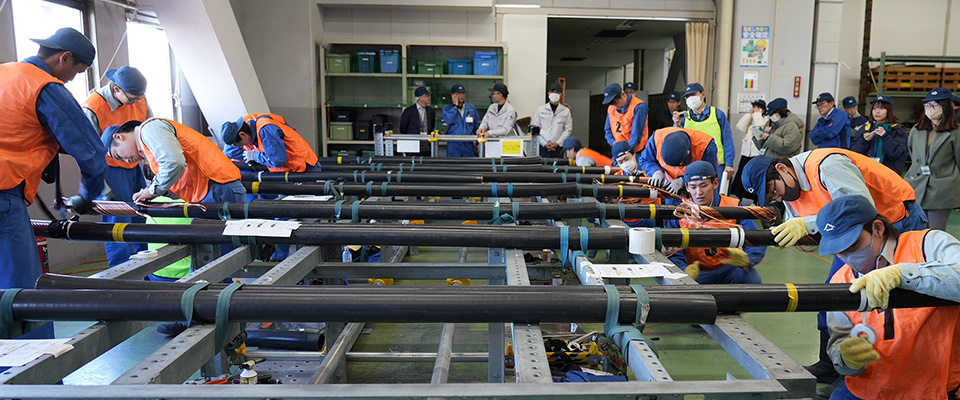 一方、接続工事の要とも言える「ケーブル処理(前の段落④参照)」の技術は、羽田事業場で実際のケーブルを用いてトレーニングを行っています。JOINTERたちは全国各地を飛び回りながら、現場と現場の間の限られた時間を活用して、ベテランの上司や先輩の指導のもとトレーニングを行い、その技術を磨いています。