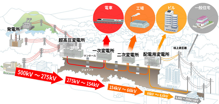 私たちが日ごろ何気なく使っている電気は、まず発電所で超高圧の電気(500~275kV)が作り出され、特殊な地中送電線(超高圧電力ケーブル)によって変電所に運ばれます。発電所からは、架空(かくう)送電線または地中送電線を通り、超高圧変電所、一次変電所、二次変電所を経て、最終的な消費地である工場やビル、鉄道、そして一般の家庭にまで電力が供給されます。最近は、再生可能エネルギーの普及などにより発電方法も多様になっていますが、作られた電気を運ぶ仕組みは変わりません。
