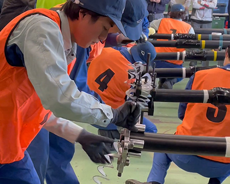 発電所から変電所、消費地まで長距離にわたり張り巡らされている電力ケーブルの長さは測り知れません。一方、一度に運べるケーブルの長さには限界があり、敷設するときにはたくさんの本数を「つなぐ」必要があります。ここで活躍するのが“JOINTER”と呼ばれる技能者たちで、電力ケーブルをしっかりとつなぐ仕事を担っています。