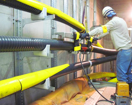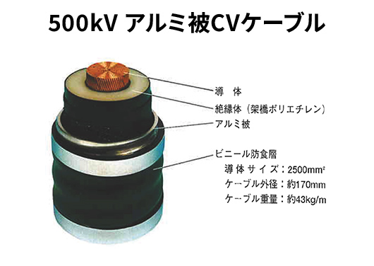 古河電工では、特別高圧から超高圧とされる66~500kV(キロボルト)の地中送電ケーブルの敷設と接続を行っています。