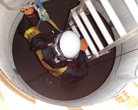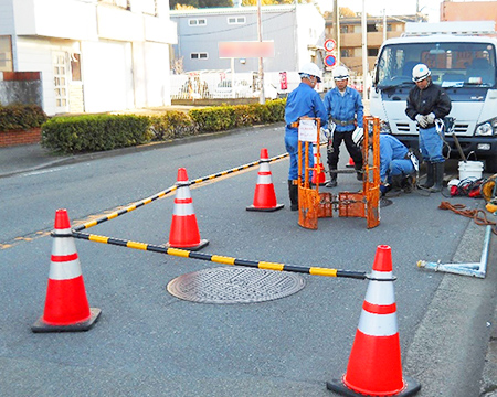 街中でよく見かけるマンホールの蓋、ここが工事の入り口です。まず、交通災害を防ぐために保安帯を設置し、はしごで地下へと潜ります。マンホールの中は暗いため、ヘルメットにライトを装着し入坑します。まずマンホール内で接続作業を行うための足場を作成し、電源や照明を設置します。
