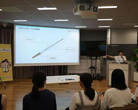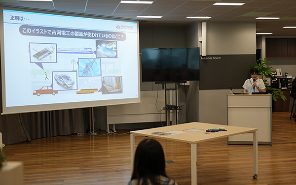 BtoB企業で、消費者に直接製品やサービスをお届けする機会がほとんどない古河電工の事業内容や製品・サービスについて知ってもらうため、まずは古河電工の会社紹介を行いました。実は鉄道や自動車、スマートフォンなど生活の身近なあちこちで古河電工の技術が活躍していることを紹介しました。