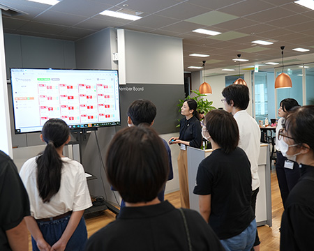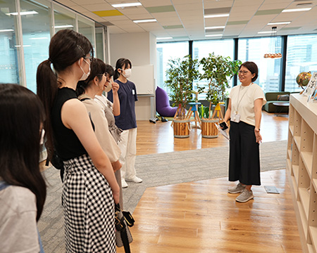 次に、本社見学ツアーを実施。実際に従業員が働くスペースも通りながら、本社オフィスをひと通り案内しました。