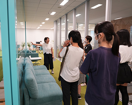 各エリアのコンセプトを紹介してから、従業員が執務中の部屋の中まで見学