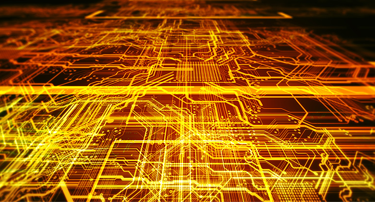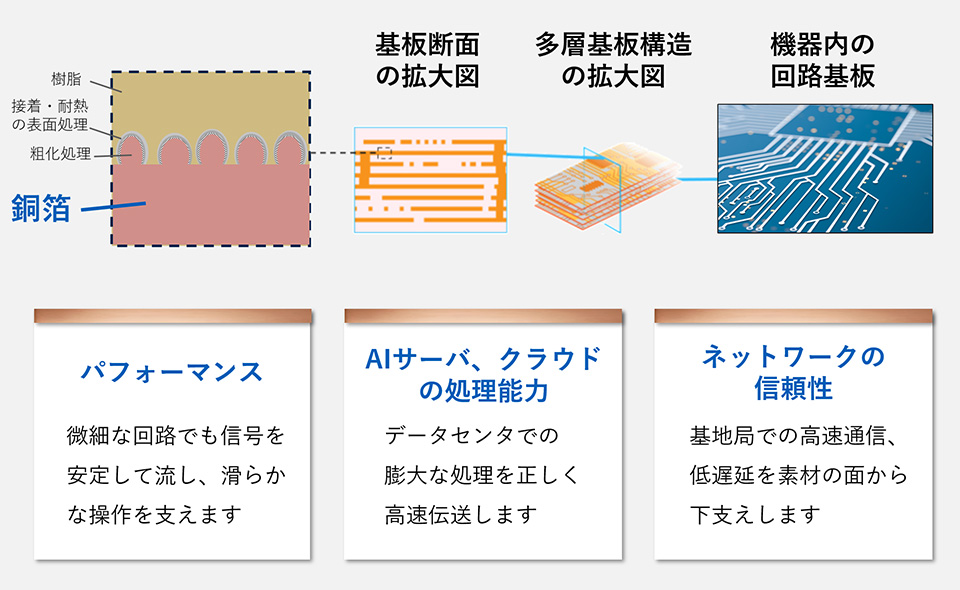 複雑に重なる多層基板の深部で、信号をロスなく、真っ直ぐに届けること。回路の品質、つまり銅箔の品質が、デジタル社会の揺るぎない信頼性を支えています。
