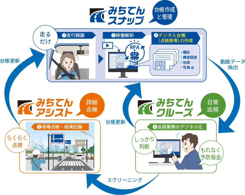 さらに、附属物巡視支援システム「みちてんクルーズ」は、道路巡回車に取り付けたドライブレコーダーの走行動画から、点検表の記載情報に基づき、あらためて道路附属物の動画をコンパクトに切り出しデータ化。道路附属物の日常巡視を強化し、効率的、合理的な予防保全を実現します。
