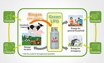 家畜のふん尿から得られる二酸化炭素とメタンから貯蔵・輸送しやすいLPガスを創出する技術についてご紹介します。