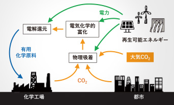 大気中に放散された希薄なCO2を物理/化学的手法にて回収・富化し、再生可能エネルギーを駆動力とする 電気化学プロセスにより還元資源化する統合システムを開発します。 大気中の CO2を対象とし、電気化学プロセスの特長を活かして小規模分散配置が可能なフレキシブルかつスケーラブルなシステムを確立します。