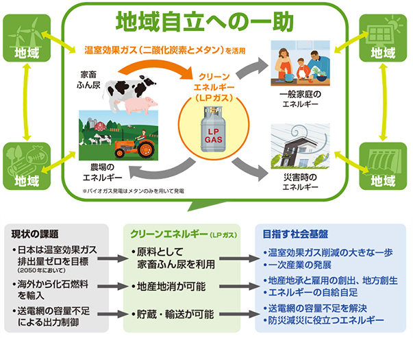 地産地承エネルギープロジェクトチームでは地域に新たな活力を生み出す技術、Succession Booster®の実用化を目指し、開発を進めています。その一例として現在は家畜ふん尿に着目し、バイオガス由来の二酸化炭素とメタンを原料に、グリーンLPガスを創出する技術を開発しています。温室効果ガスの再資源化による温室効果ガスの削減に加えて、エネルギーの地産地消を実現することで地域に新たな活力を生み出し、地産地承へ貢献します。