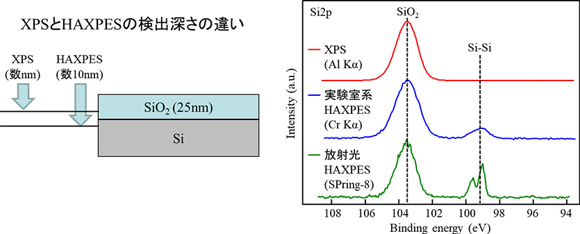 また、大学や公的機関との共同研究なども行っており、常に最先端の分析・評価技術の導入・開発に努めています。特に表面分析の分野では一般的な X 線光電子分光法(XPS)に加え、SPring-8 と同等の深さ情報が得られる硬 X 線光電子分光法(HAXPES)が可能な分析装置を他社に先駆けて導入するなど、最新の装置導入も積極的に行っています。