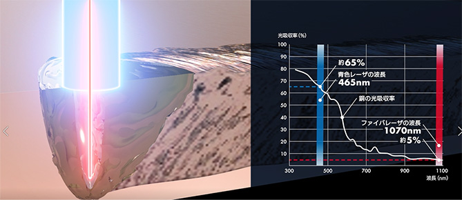 導電率、熱伝導率に優れた銅はe-Mobilityの主要パーツとして多く用いられています。一般的に、ファイバレーザは高いビーム品質や高パワー密度といった特長から、被加工物に対して局所的に深い溶け込みを得ることができ、加工部周辺への熱影響を抑えた加工ができます。しかし、銅はファイバレーザの波長である赤外光に対する反射率の高さや熱伝導率の高さによる熱拡散のために、溶融が起こりづらく、安定した加工が難しい材料です。そこで当社は、銅に対して光吸収率が55~60%と高く、より効率的な入熱が可能となる青色レーザと世界トップレベルのビーム品質で知られる当社の赤外ファイバレーザとを組み合わせ、「高速・高深度加工」を実現いたしました。高出力青色レーザダイオードモジュールについては、青色半導体レーザの世界トップメーカである日亜化学工業株式会社殿と共同で開発しました。