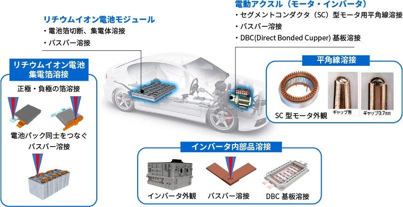 このモータとバッテリーには、導電率、熱伝導率に優れた銅や、銅を含んだ複合材料が主要パーツとして多く用いられており、それらに対する高精度な接合技術が求められています。