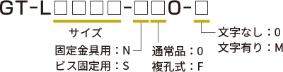 固定用ビスを使用する場合、トラフ(サイズ120S、150S)は固定金具用のGT-□□□□□-N□0-□を、トラフ(サイズ150B、200B、300B、400B、430C)はビス固定用のGT-□□□□□-S□0-□を使用します。