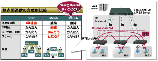 - 全拠点で共通の鍵を用いて暗号化通信を行う。共通鍵や各拠点への経路はMPSAサーバから配信