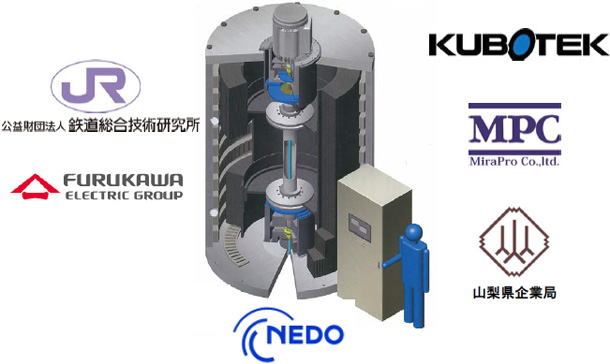 今回のプロジェクトは、鉄道総研が古河電工、クボテック、ミラプロ、山梨県企業局を取りまとめて開発を進めています。超電導磁気軸受については、鉄道総研と古河電工が共同で開発を行い、鉄道総研が超電導磁気軸受全体の基本設計を実施し、古河電工が高温超電導マグネットの設計・製作を実施しました。なお、この超電導磁気軸受は、これまで鉄道の蓄電技術としての応用を目指して、鉄道総研において平成24年度まで国土交通省の国庫補助金を受けて開発されたもので、本プロジェクトの中で、大型化と実用化に向けた開発を進めています。