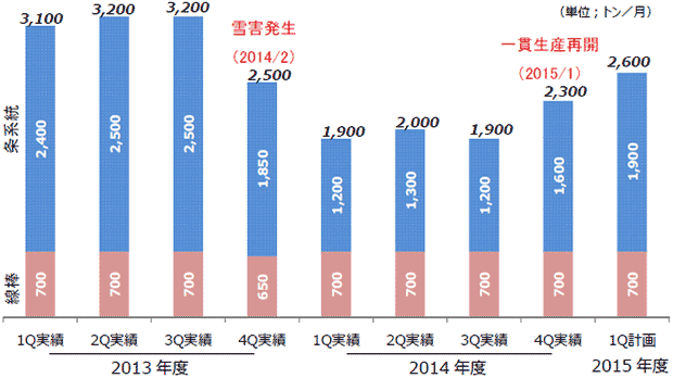 2014年2月に発生した雪害による一貫生産の停止により、銅条製品の生産数量は従前比の約60%まで落ち込みましたが、計画通りの復旧と事前のサンプル対応により、本年1月以降の生産数量は順調に回復しており、今年度第1四半期末では同85%程度までの回復を見込んでいます。