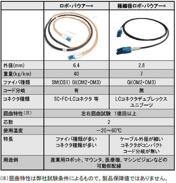 古河電工グループの岡野電線株式会社(本社;神奈川県大和市深見西一丁目5番28号 社長;瀬戸 勝)は、繰り返し曲げに耐えられる光ファイバケーブルであるロボ・バウアー®をより細く、より軽くコンパクトにした極細径ロボ・バウアー®を本年2 月から販売を開始しました。
