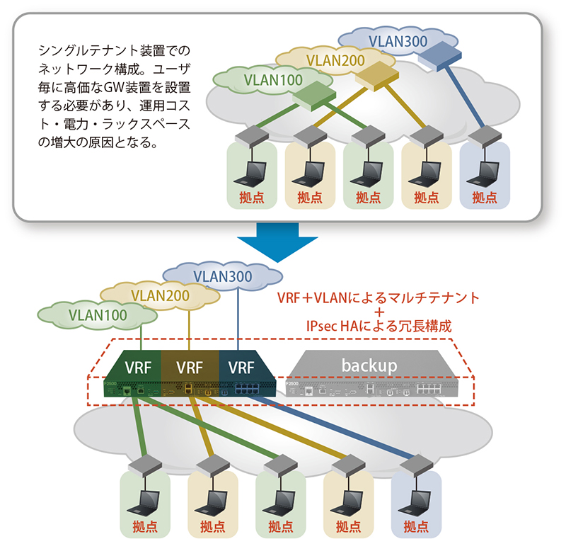 複数のテナントユーザを、独立したVRF(注3)(エンハンスで対応予定)やVLAN毎に収容することでマルチテナント収容が可能です。ユーザトラフィックを収容するトンネルとして、IPsecトンネル、EtherIPやL2TPv3などのL2トンネルが選択でき、多彩なネットワーク構築が可能です。