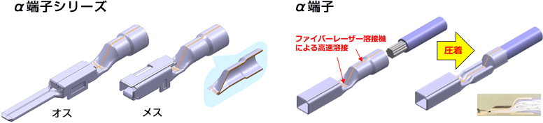当社は、世界トップレベルの優れた防食性能および防食処理コストの削減、既存コネクタハウジングへの適用を実現したアルミ電線W/H用防食端子「α端子シリーズ」の開発に世界で初めて成功し、当社三重事業所で全21種類を量産するなど、今後もラインナップを拡大する方針です。