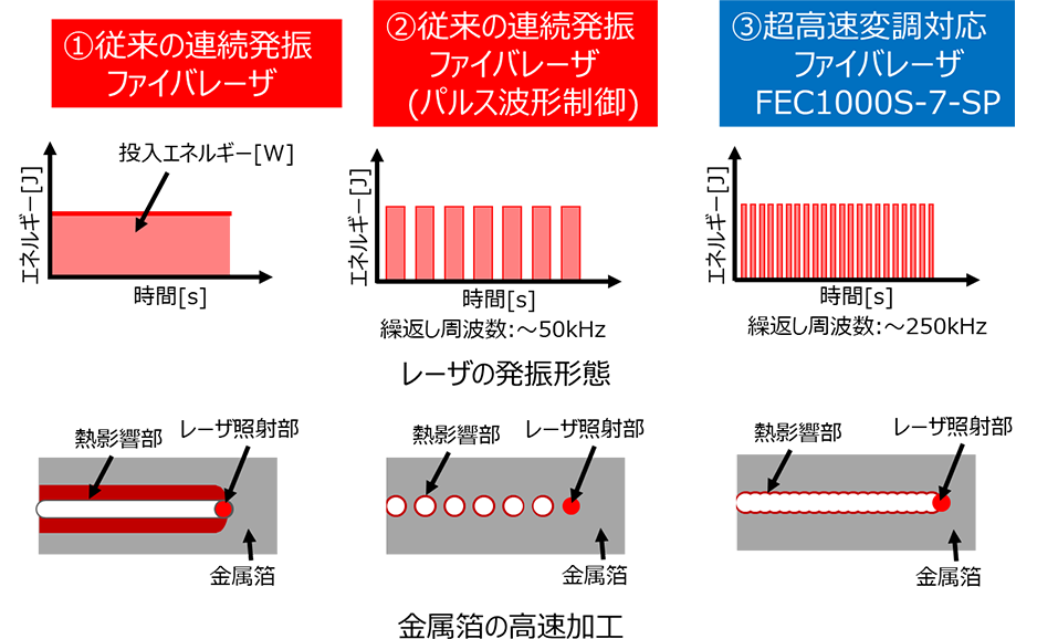 レーザを用いた加工は高精度・高速・非接触であるといった特徴から、既存工法では困難な加工を実現することができ、LiBの製造工程への導入も検討されていました。一方で、LiB電極である銅箔・アルミ箔の切断に適用する場合、その反射率の高さから高パワー密度のレーザが必要となり、従来の連続発振レーザでは過剰入熱による切断面の溶融物や表面の熱影響部が発生しやすく、加工品質の確保が非常に困難でした。また、レーザ加工による入熱を減少させる方法として連続発振レーザをパルス波形制御する技術がありますが、従来のレーザのパルス波形制御は50kHz以下の繰り返し周波数が限界であり、高速で加工する際にパルスが重ならず、連続して加工ができないという課題がありました。