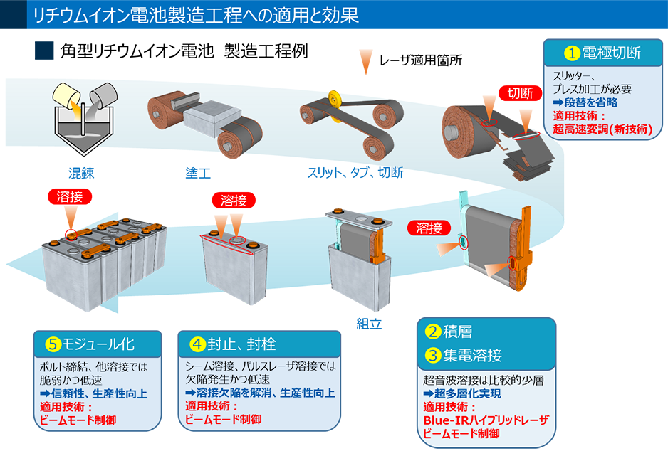 「ビームモード制御」、「Blue-IRハイブリッドレーザ」、「超高速変調対応ファイバレーザ」の3つのレーザ加工ソリューションにより、LiBの製造工程における適用を拡大していきます。