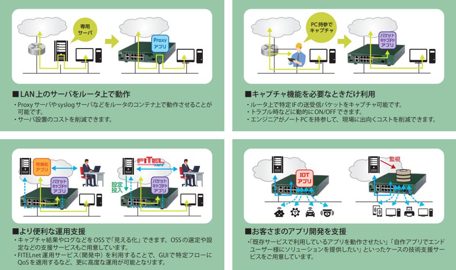 企業ネットワークで培った高い可用性とセキュリティ性をもつ専用ルータの機能・性能に、White Box製品の柔軟性を加えた非常に汎用性の高い製品です。ルータ装置内に自由にアプリケーションをアドオンできるアーキテクチャを持ち、OSSや自作のアプリケーションを利用することが可能になりました。