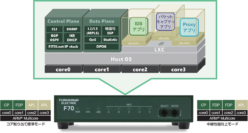 FITELnet®シリーズのエントリーモデルとして初めて、ARM®マルチコアにコントロールプレーン(C Plane)とデータプレーン(D Plane)を独立させて配置するC/D分離のアーキテクチャを採用しました。コントロールプレーンとデータプレーンをそれぞれ別のCPUコアに割り当てることで、処理の干渉を防ぎ、処理速度の遅延などを解消します。また、別のコアにコンテナ型仮想化技術「LXC(Linux Containers)」を搭載し、その上に任意のネットワークアプリをアドオンすることが可能です。利用目的に応じてコア配分を変更する機能もサポートします。