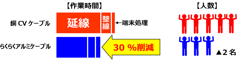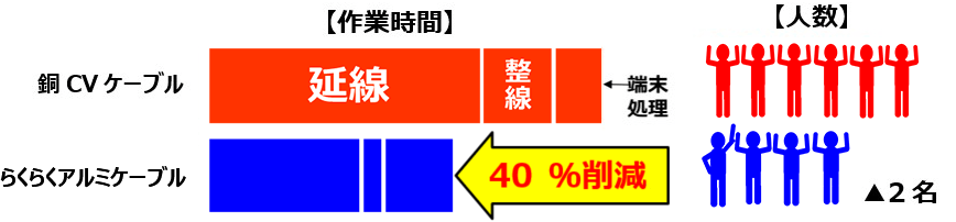 - 当社が開発したアルミ導体ケーブルは軽くて柔らかいため、作業負荷の軽減に効果があります。