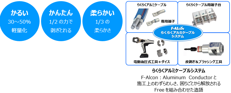 「らくらくアルミケーブル」とは、導体にアルミニウム、絶縁被覆に柔軟性架橋ポリエチレンを採用した高機能型低圧CVケーブルです。「かるい」「かんたん」「柔らかい」といった特長があります。端末処理を安心して行っていただけるよう、専用圧縮・圧着端子、端子台、端末処理の専用工具をご用意し、「らくらくアルミケーブルシステム」としてケーブルからつなぎ込みまでを一貫したシステムとしてお客様に提案しています。