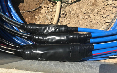 導体にアルミニウムを採用し、ケーブルシースが青く、銅導体CVケーブルとの識別が容易な「らくらくアルミケーブルTM」には、盗難防止効果が期待できます。また、「かるい」「かんたん」「柔らかい」といった特長は、早期復旧を望む現場の作業効率改善に貢献します。施工を行った電気工事業者様からは、「延線作業はパワーボールといった機材は使わずとも人力のみで予定通り終わらせることができた。ケーブル自体も軽くて柔らかく、扱いやすいのには驚いた。これだけの量を人手で延線するのは他のケーブルでは難しい。」との評価をいただきました。接続処理も、ケーブルが軽くて柔らかく取り回しやすいので、狭いトラフの中での接続にも関わらずスムーズに進み、天候に左右されず予定通り復電することができました。敷地には「らくらくアルミケーブルTM」を使用している旨を記した盗難防止の看板が掲げられています。
