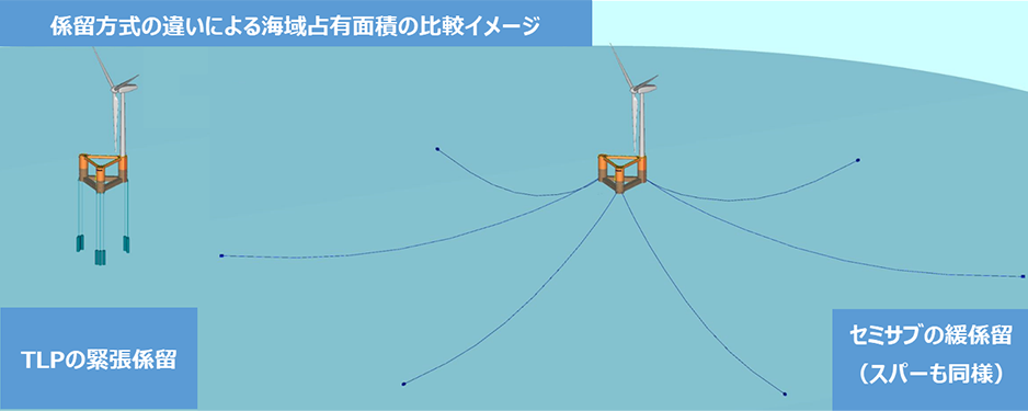 今回の調査研究では、洋上風力発電の浮体の係留方式として国内外で実証が進む緩係留方式ではなく、緊張係留方式(Tension Leg Platform式(以下、「TLP」))の浮体・係留システムを採用し低コスト化を図ります[図1、図2参照]。本調査研究では、TLPの浮体の優れた動揺特性を活かし実事業で想定される10MW超級の大型風車を搭載する浮体として必要な構造信頼性を確保すると共に動揺が少ないことによる、風力発電設備と海底送電システムの耐久性向上による低コストな次世代浮体システム及び海底送電線システムの開発を行います。また、緩係留方式に比べて、係留索による海域占用面積を大幅に削減できるため、漁業や船舶運航への影響を抑えて、優れた社会受容性を発揮することができます。