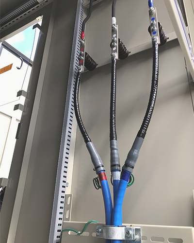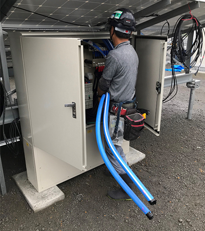 今回、高圧キュービクル間の配線に60mm2の6600V AL-CVTケーブル、集電箱~接続箱間の配線に100mm2の600V AL-CVDケーブル、接続箱~PCS間の配線に400mm2の600V AL-CVDケーブルを納入しました。また、キュービクル内での端末処理に屋内終端接続材料(古河電工パワーシステム株式会社製)を納入しました。